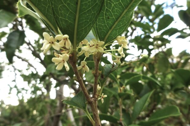 ギンモクセイは白い(しろい)花(はな)を咲かせ(さかせ)ます。キンモクセイはオレンジ色(しょく)の花(はな)を咲かせ(さかせ)ます。それぞれ銀色(ぎんいろ)と金色(きんいろ)とは少し(すこし)違い(ちがい)ますが、華やか(はなやか)に咲く(さく)姿(すがた)をみるとなんとなく納得(なっとく)してしまいます。