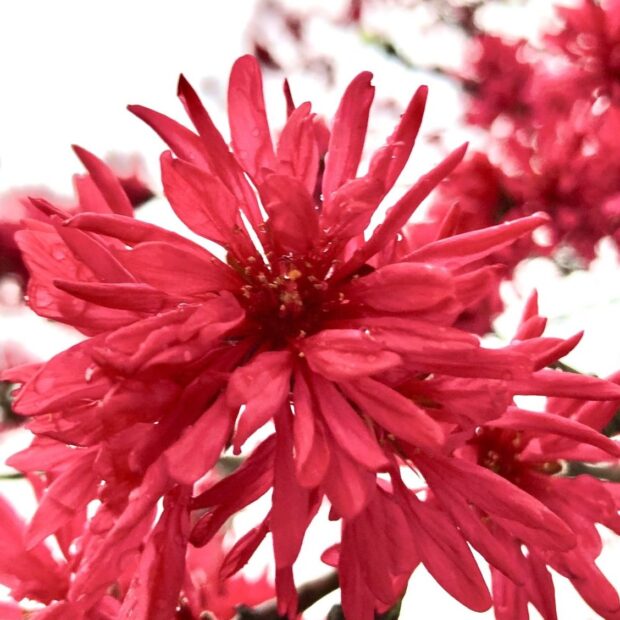 キクモモの花びら(はなびら)は、1枚(まい)の花びら(はなびら)が何(なん)枚(まい)にも分かれ(わかれ)たものになります。なので雄しべ(おしべ)はちゃんとあり、実(み)をつけることができます。