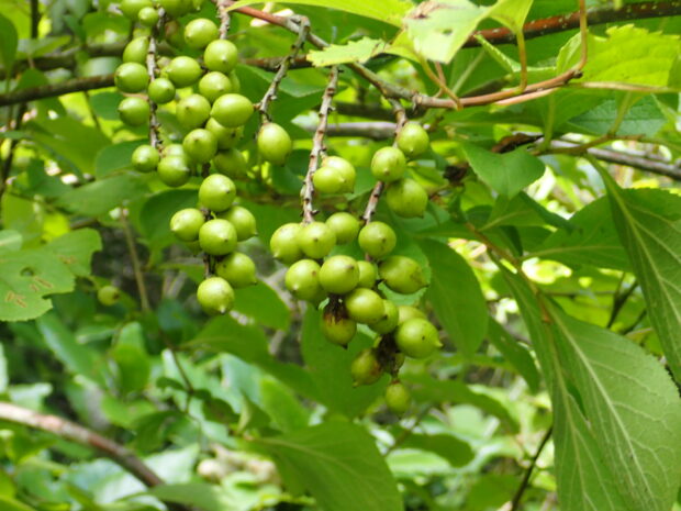 キブシの実は(じつは)すりつぶしたものを粉(こな)にして歯(は)を黒く(くろく)染める(そめる)お歯黒(おはぐろ)の材料(ざいりょう)とされました。お歯黒(おはぐろ)は五倍子(ふし)(ヌルデの虫(むし)こぶ)から作る(つくる)のですが、その代用(だいよう)品(ひん)として使わ(つかわ)れたのです。そこから木(き)五倍子(ふし)(きぶし)という名前(なまえ)とよばれるようになりました。