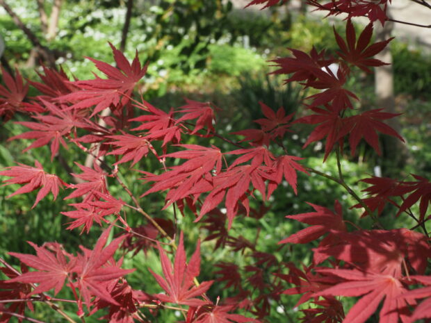 ノムラモミジの()は、(はる)新緑(しんりょく)から(あき)紅葉(こうよう)まで赤色(あかいろ)をしています