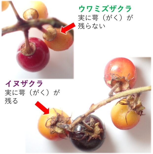 イヌザクラとウワミズザクラはよく似(に)ています。見分ける(みわける)コツは、花(はな)の下(した)の葉っぱ(はっぱ)の数(かず)です。 また実(み)の時期(じき)であれば、実(み)の後ろ(うしろ)の萼(がく)の形(かたち)で見分け(みわけ)がつきます。