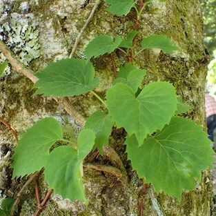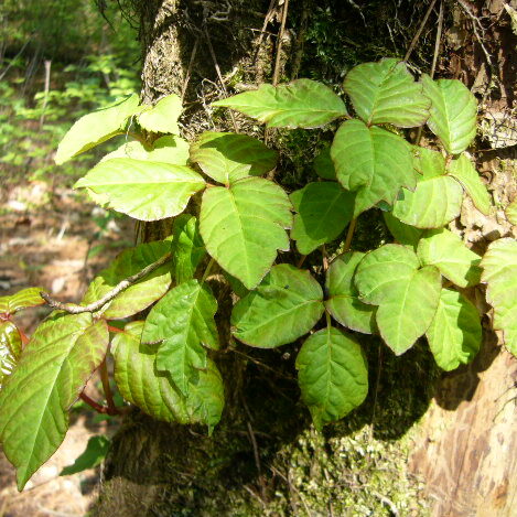 1番(ばん)がツタウルシです。3枚(まい)セットになった葉(は)を覚え(おぼえ)てください。2番(ばん)はツルアジサイ、3番(ばん)はイワガラミです。3つとも一緒(いっしょ)にはえていることも多く(おおく)、写真(しゃしん)のように木(き)に絡む(からむ)ので間違え(まちがえ)やすいです。ツルアジサイとイワガラミはツル植物(しょくぶつ)にしては成長(せいちょう)が遅く(おそく)、絡ん(からん)だ木(き)を覆う(おおう)ことはほぼありません。