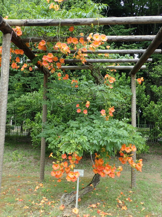 ノウゼンカズラの(はな)(なつ)咲き(さき)ます。(はな)少ない(すくない)時期(じき)なのでとても目立ち(めだち)ます。