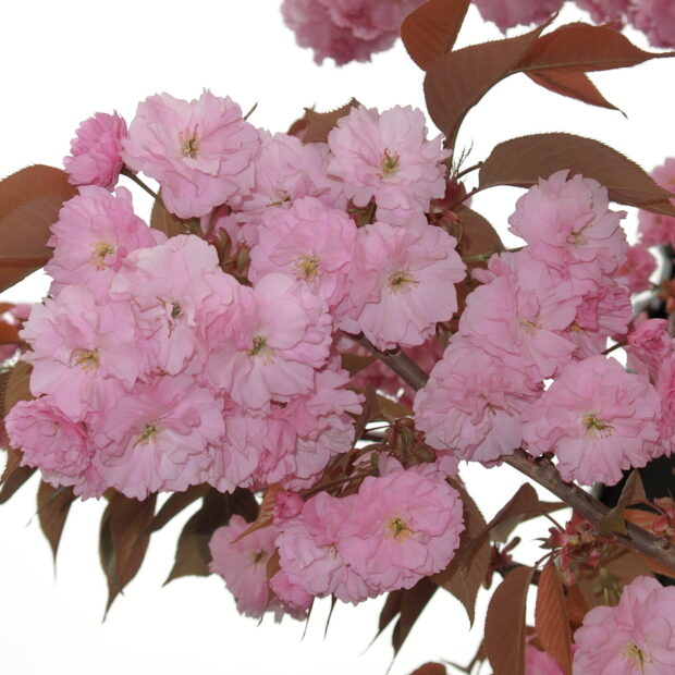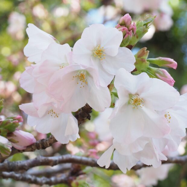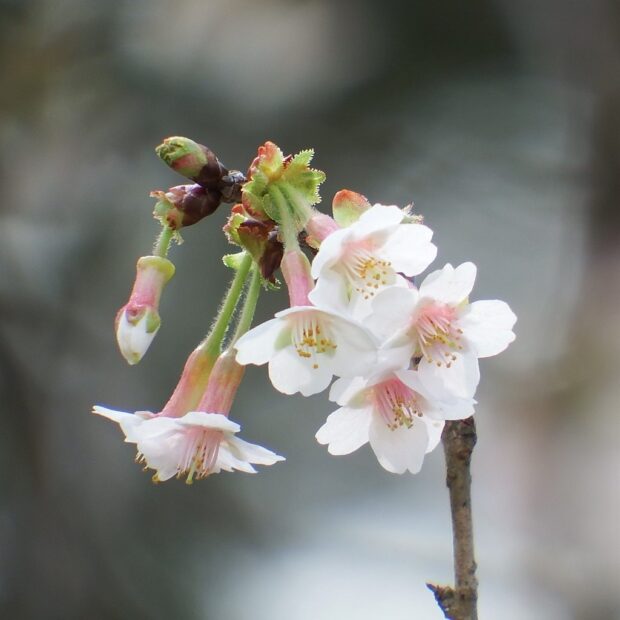 チョウジザクラの花(はな)は、花びら(はなびら)が小さめ(ちいさめ)で水平(すいへい)に開き(ひらき)ます。横(よこ)から見る(みる)と丁(ひのと)の字(じ)に見える(みえる)ので名前(なまえ)に丁字(ていじ)とつきました。