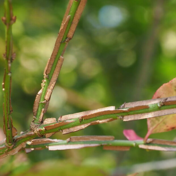 マユミという木(き)に似(に)ていて小さい(ちいさい)ことが名前(なまえ)の由来(ゆらい)ですが、マユミよりもニシキギという木(き)に近い(ちかい)仲間(なかま)です。ニシキギの枝(えだ)に見(み)られる「翼(つばさ)」がないのがコマユミです。 (写真(しゃしん)は「翼(つばさ)」のあるニシキギ)