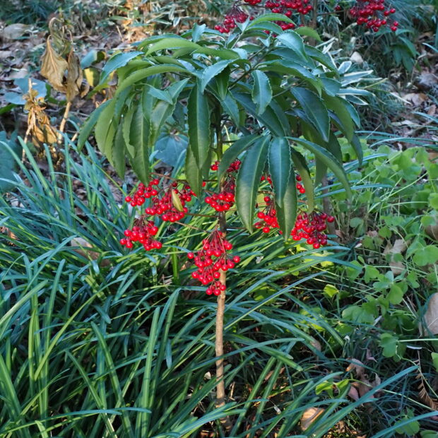 マンリョウと共生(きょうせい)しているバクテリア(葉(は)粒(つぶ)菌(きん)・細菌(さいきん))は種(はしゅ)で引き継が(ひきつが)れるそうで、人工(じんこう)的(てき)にバクテリアを除去(じょきょ)した種(たね)を育て(そだて)たら委縮(いしゅく)して育た(そだた)なかったそうです。