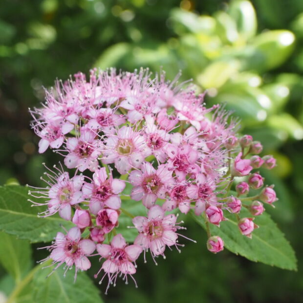 シモツケの花(はな)の多く(おおく)はピンク色(ぴんくいろ)です。濃い(こい)ピンクや薄い(うすい)ピンク、白い(しろい)色(いろ)の花(はな)もあります。
