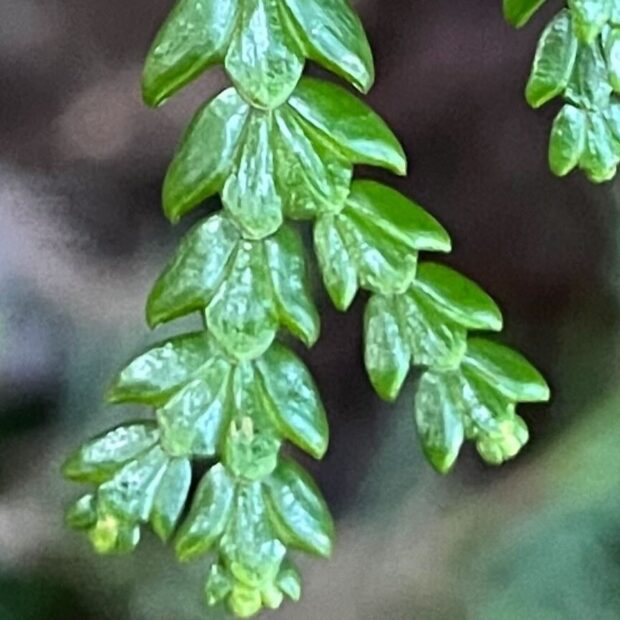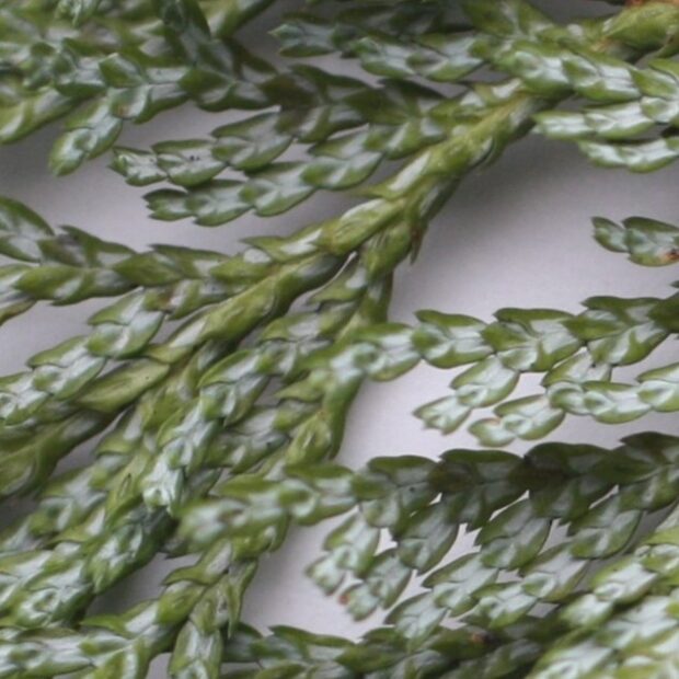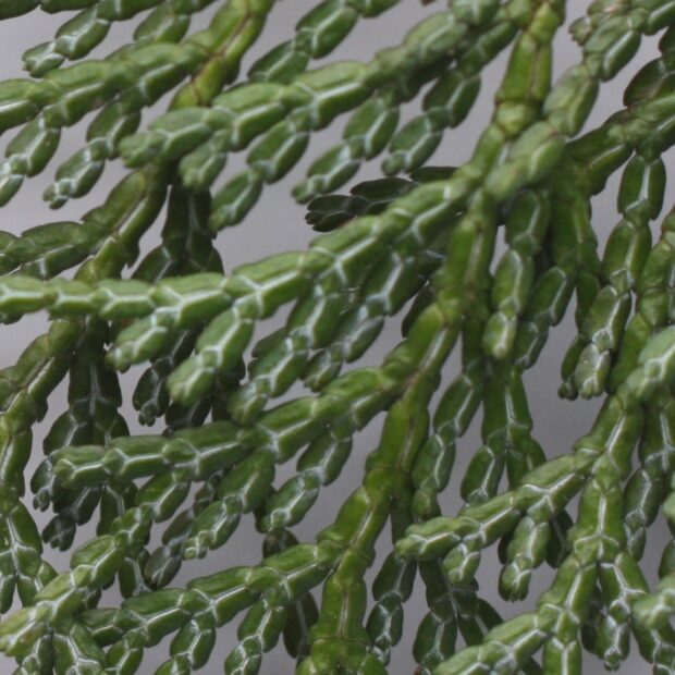 アスナロの()厚く(あつく)大形(おおがた)鱗片(りんぺん)(がた)(えだ)十字(じゅうじ)対生(たいせい)します。 真ん中(まんなか)(した)のような(かたち)左右(さゆう)(ふね)のような(かたち)をしています。