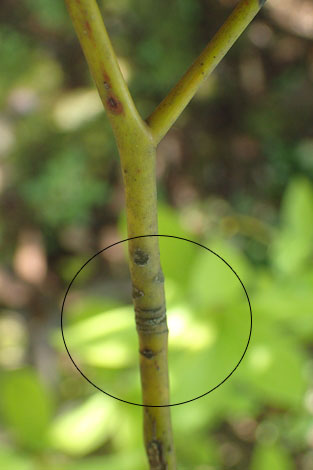 木(き)の枝(えだ)は新芽(しんめ)から半年(はんとし)~1年(ねん)伸び(のび)ますが、枝分かれ(えだわかれ)は来年(らいねん)という木(き)が多い(おおい)と思い(おもい)ます。クロモジは1年(ねん)で枝分かれ(えだわかれ)まで一気に(いっきに)行う(おこなう)ので、枝(えだ)の分岐(ぶんき)がなめらかで1年(ねん)ごとの境目(さかいめ)はしわしわなので、探し(さがし)てみましょう。