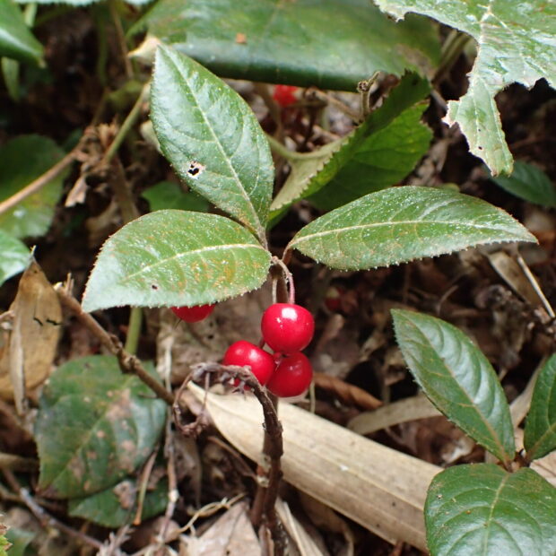 ヤブコウジは江戸(えど)時代(じだい)から、正月(しょうがつ)に「十(じゅう)両(りょう)」と呼ば(よば)れ松竹梅(しょうちくばい)と共に(とともに)縁起(えんぎ)木(き)として飾り(かざり)に使わ(つかわ)れてきました。現在(げんざい)も年末(ねんまつ)には「十(じゅう)両(りょう)」の名(な)で花屋(はなや)に並び(ならび)ます。