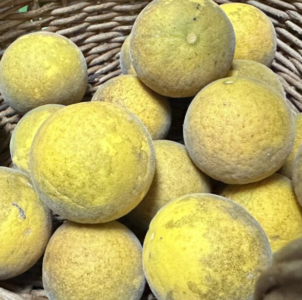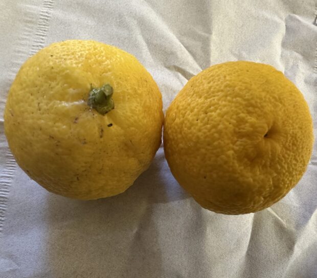 答え(こたえ)は3(ばん)です。カラタチの実は(じつは)()があって、うすよごれた小さな(ちいさな)テニスボールにそっくりです。1(ばん)はユズ(ハナユ)、2(ばん)はテニスボールです。