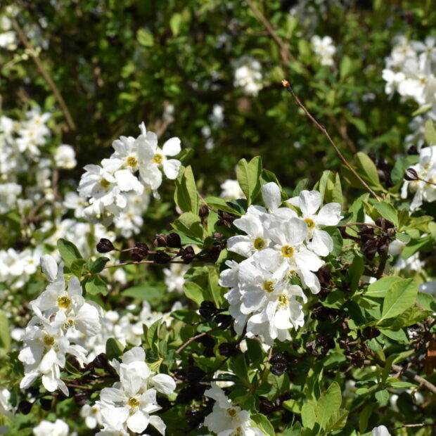 明治(めいじ)時代(じだい)に日本(にっぽん)に入っ(はいっ)てきたので、千利休(せんのりきゅう)とは接点(せってん)のない樹(き)種(しゅ)です。「ウメザキウツギ」「マルバヤナギザクラ」「バイカシモツケ」という名前(なまえ)もあったそうですが人気(にんき)が出(で)ず、「リキュウバイ」とつけたら人気(にんき)が出(で)たそうです。