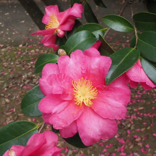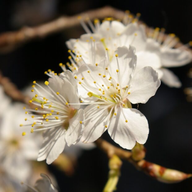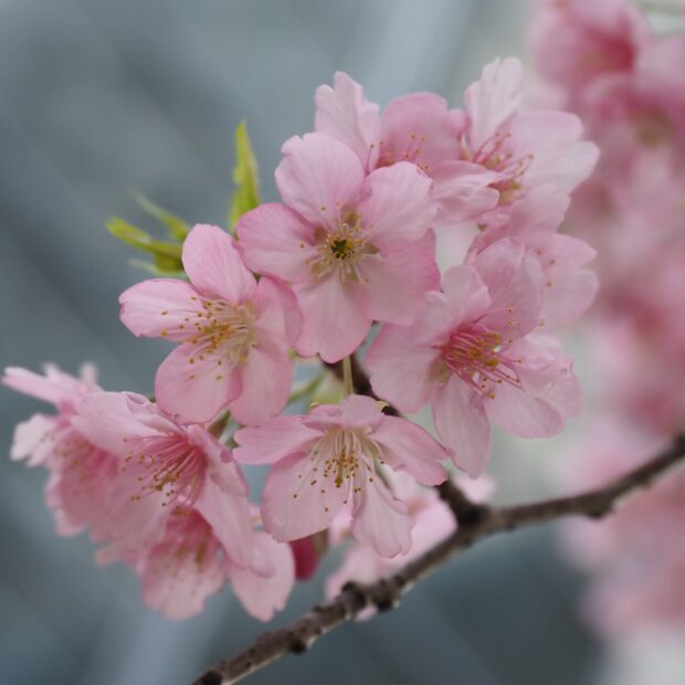シナミザクラの花(はな)は早春(そうしゅん)に葉(は)の展開(てんかい)よりも先(さき)に咲き(さき)ます。一重(ひとえ)の白色(はくしょく)で切れ込み(きれこみ)は無く(なく)、 先端(せんたん)は少し(すこし)凹み(へこみ)ます。 おしべが長く(ながく)目立ち(めだち)ます。 A:サザンカ C:カワヅザクラ