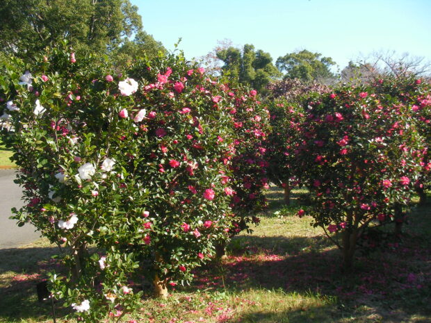 当(とう)園(えん)はサザンカの名所(めいしょ)として知ら(しら)れています。C地区(ちく)のテニスコート沿い(ぞい)を中心(ちゅうしん)に園内(えんない)全域(ぜんいき)に約(やく)50園芸(えんげい)品種(ひんしゅ)、 4000本(ほん)あります。 11月(つき)初旬(しょじゅん)から1月末(げつまつ)頃(ごろ)迄(まで)次々(つぎつぎ)と咲き誇り(さきほこり)ます。