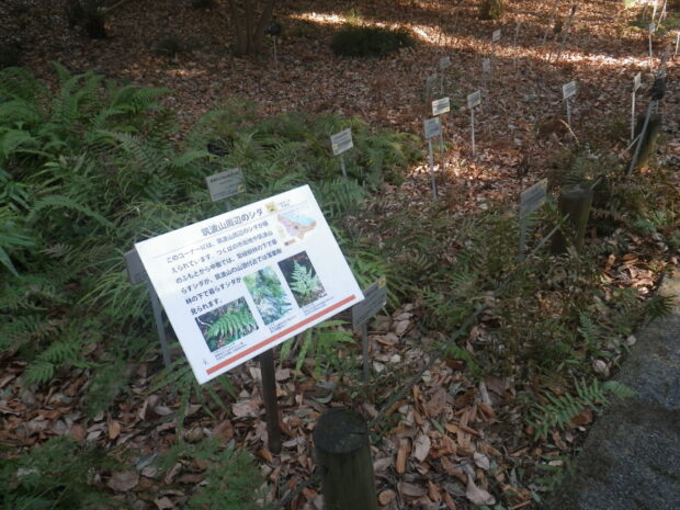 筑波山周辺に生育するシダが植えられています。 つくばの市街地や筑波山のふもとでは常緑樹林で暮らすシダが、 筑波山の山頂付近では落葉樹林の下で暮らすシダが見られます。