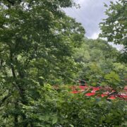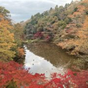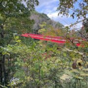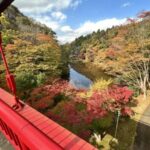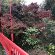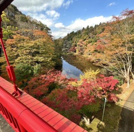 • 池越しに見る真っ赤な吊橋は谷の景観の良いアクセントにもなっている