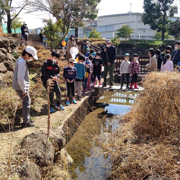 小学校に隣接する斜面林のふちを流れる用水になります。 埼玉県の絶滅危惧種のアカガエルが生息しており、 小学校、 エコクラブで保護活動をしています。