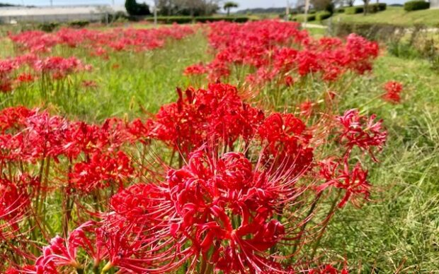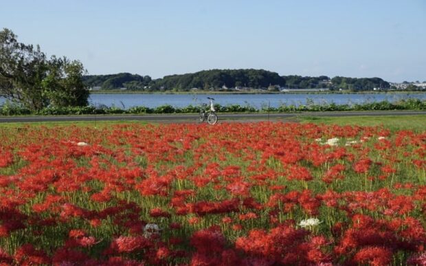 手賀曙橋から西側約2キロに渡って、 深紅の美しいヒガンバナが観られます。