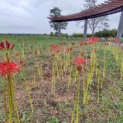 ヒガンバナの赤い花には、 大きなアゲハチョウがやってきます。 ぜひ見つけてください。