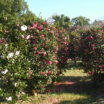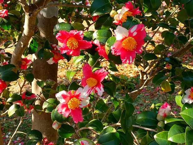 当園のシンボルであるサザンカは、 C地区のテニスコート沿いを中心に園内全域に約50園芸品種、 4000本あります。 11月初旬から1月末頃迄次々と咲き誇ります。 可憐な白い花はサザンカの「原種」、 あでやかな「鎌倉絞り」、 「笑顔」は明桃色の大輪の花、 その他「昭和の栄」、 「富士の峰」、 「想夫恋」等々見応え充分です。