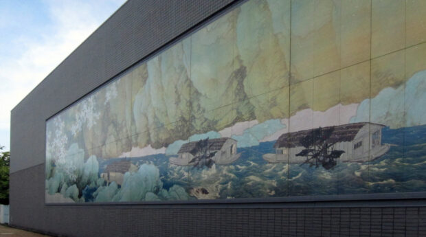 重要文化財の川合玉堂「行く春」(六曲一双屏風)を、 長さ21.6m、 高さ5.04mの大陶板画(信楽焼)にしました。 屋外に展示した日本画の大型美術陶板としては、 日本一の大きさです。